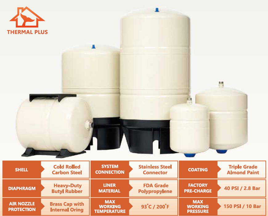 THERMAL-PLUS expansion tanks are designed to effectively absorb the expanded water volume, maintaining safe and consistent pressure levels within your water heating system. By accommodating the expansion, these tanks prevent overpressure and safeguard your plumbing system from potential damage.