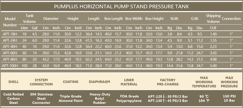 PumPlus Pressure tank is an essential part of a pressurized water system that provides water pressure at a set level. The tank stores supplemental water between diaphragm and liner, and the pressurized air chamber is able to create a supply circle. This process reduces the number of times the motor need to start in order for the system pressure to remain at the set level.